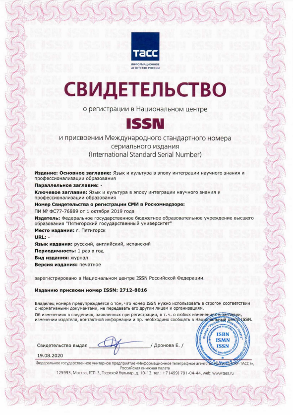 Все материалы, поступившие для публикации в выпуске журнала «Язык и культура в эпоху интеграции научного знания и профессионализации образования» подлежат регистрации ответственным секретарем журнала.